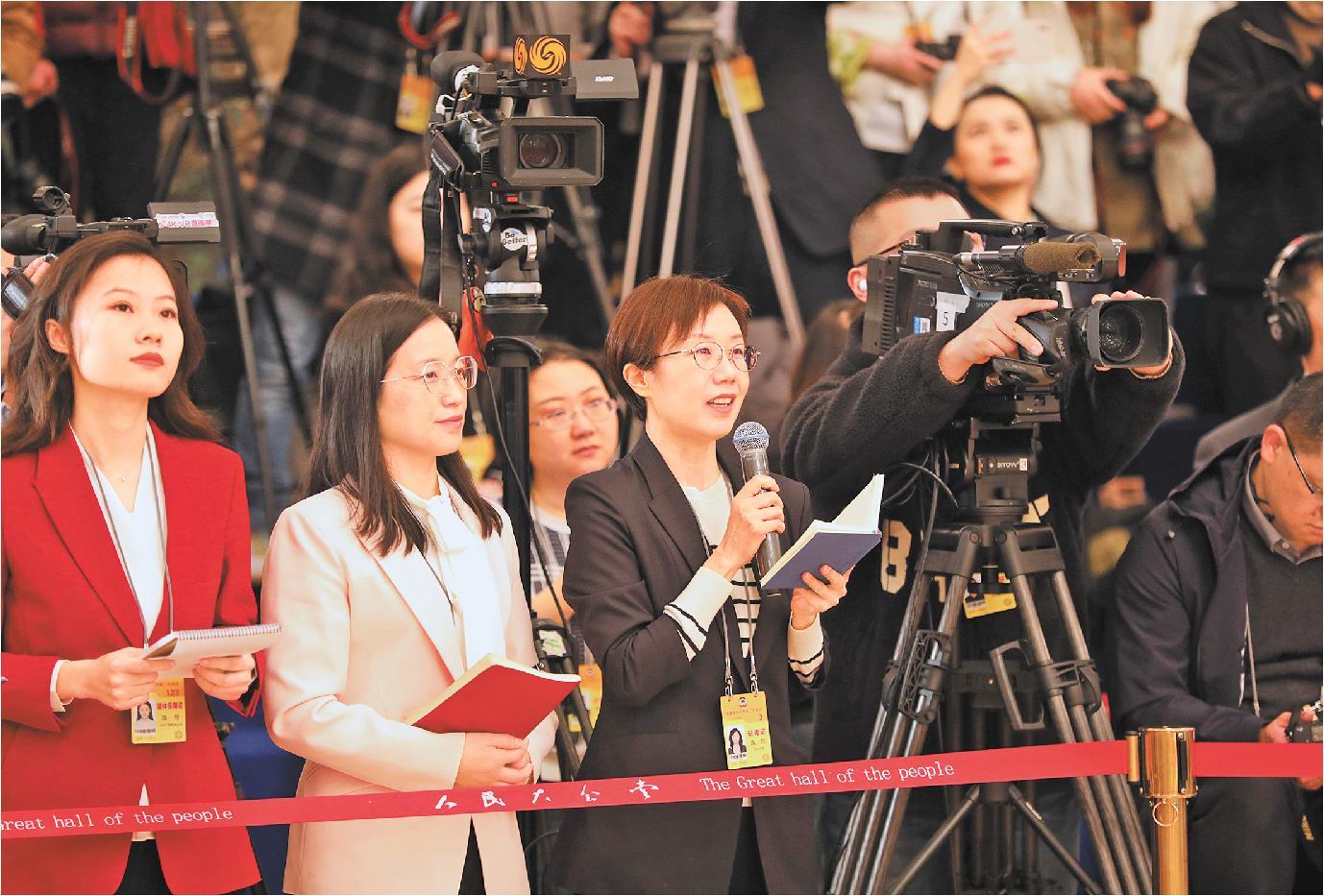 第三场“委员通道”集体采访中,本报记者魏然(前左三)就促进民营企业高质量发展问题提问全国政协委员林孝发。 □记者 卢鹏 报道