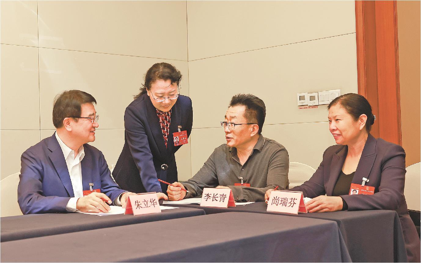 3月10日,出席十四届全国人大二次会议的山东代表团朱立华(左起)、孙晓颖、李长青、尚瑞芬代表,就我省经略海洋和推进绿色低碳发展交流讨论。