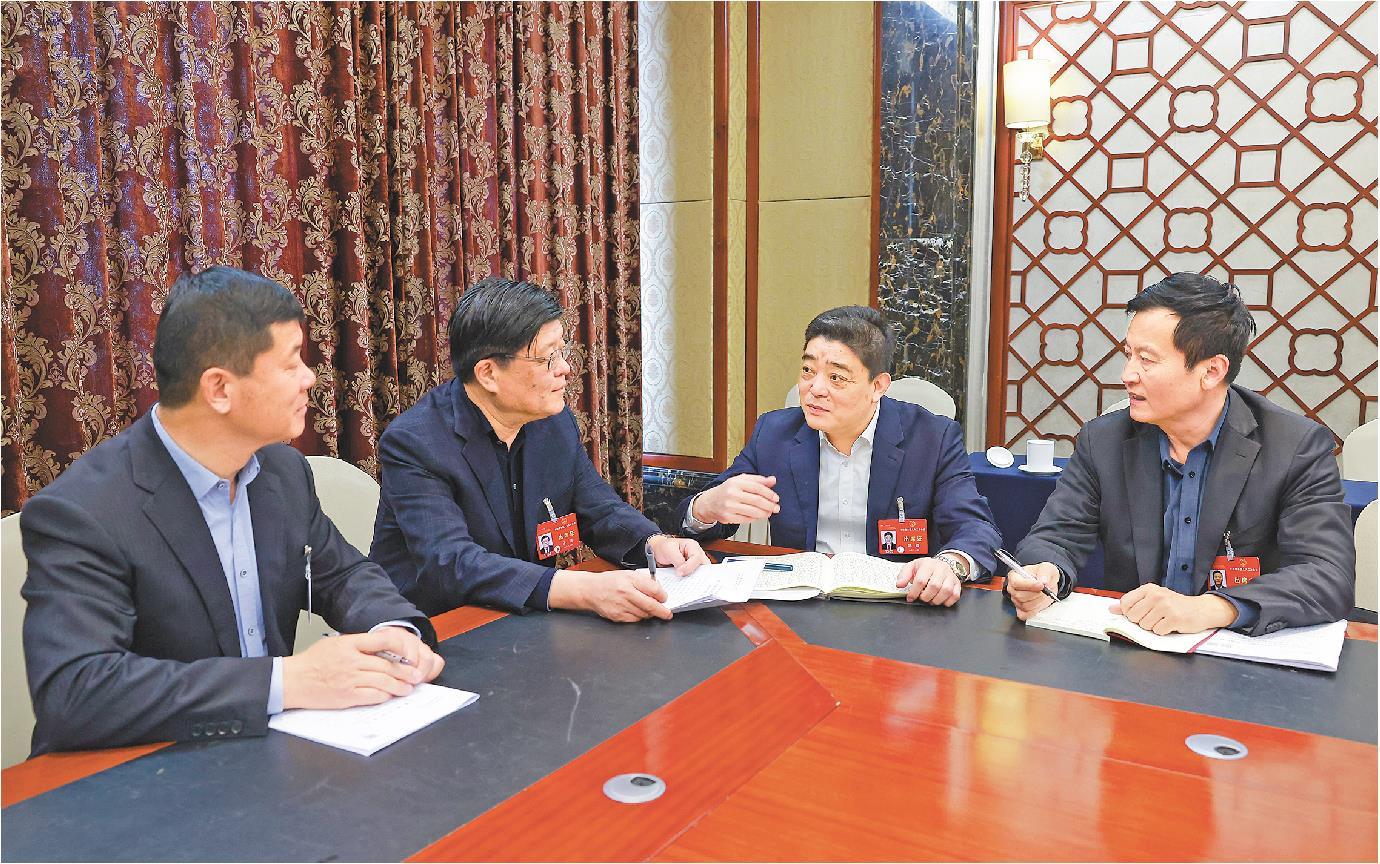3月10日,出席十四届全国人大二次会议的山东代表团魏德东(左起)、王刚、韩峰、刘子斌代表,围绕增强发展内生动力与扩大高水平对外开放等进行交流。