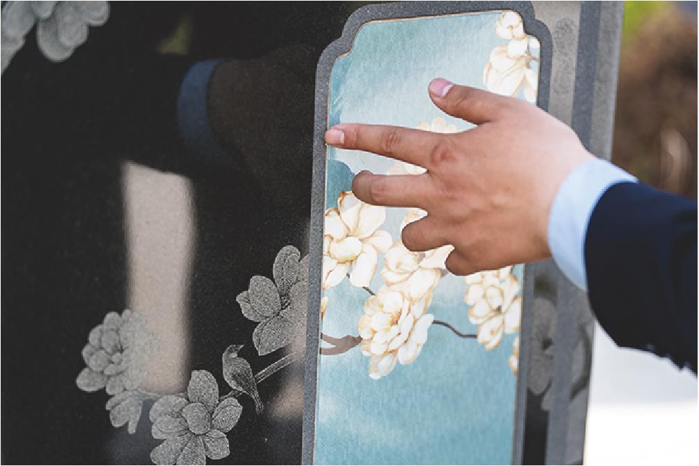 李晓东介绍墓碑上的设计元素,他指向的圆形装置可以开关,里面摆放着逝者的照片。