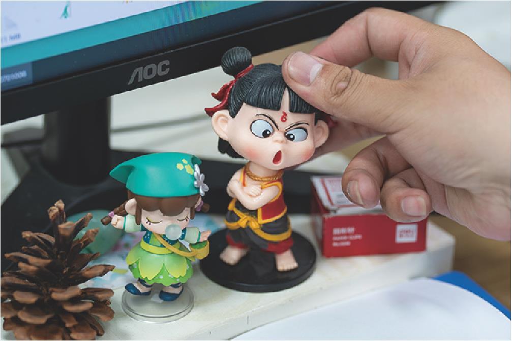 “00后”的李晓东喜欢在办公桌上放置一些个性鲜明的小摆件,他说这些东西可以激发他的灵感。