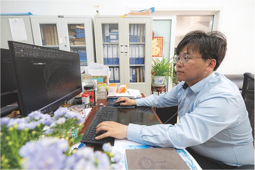 李晓东在电脑上用相关软件设计绘制墓碑上的图案。