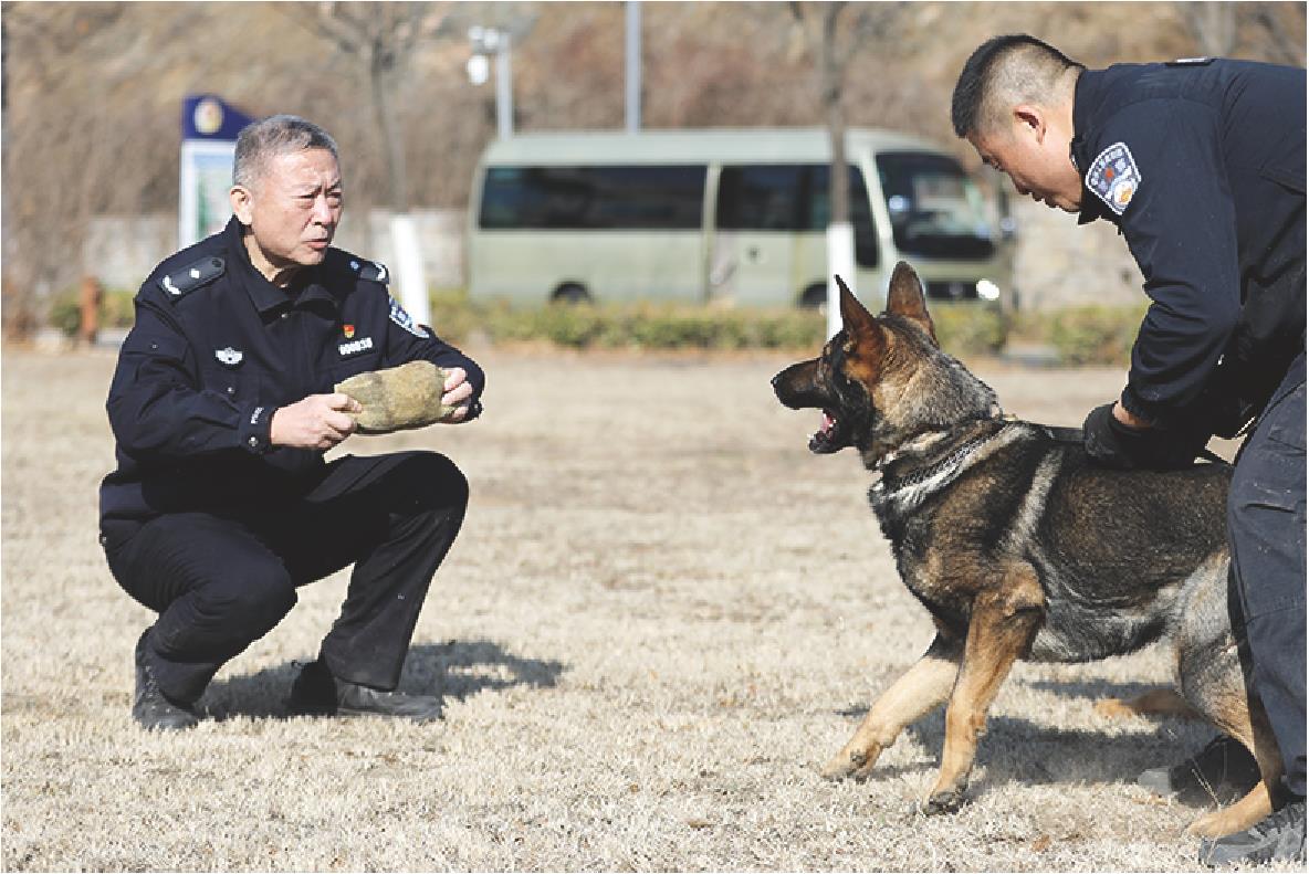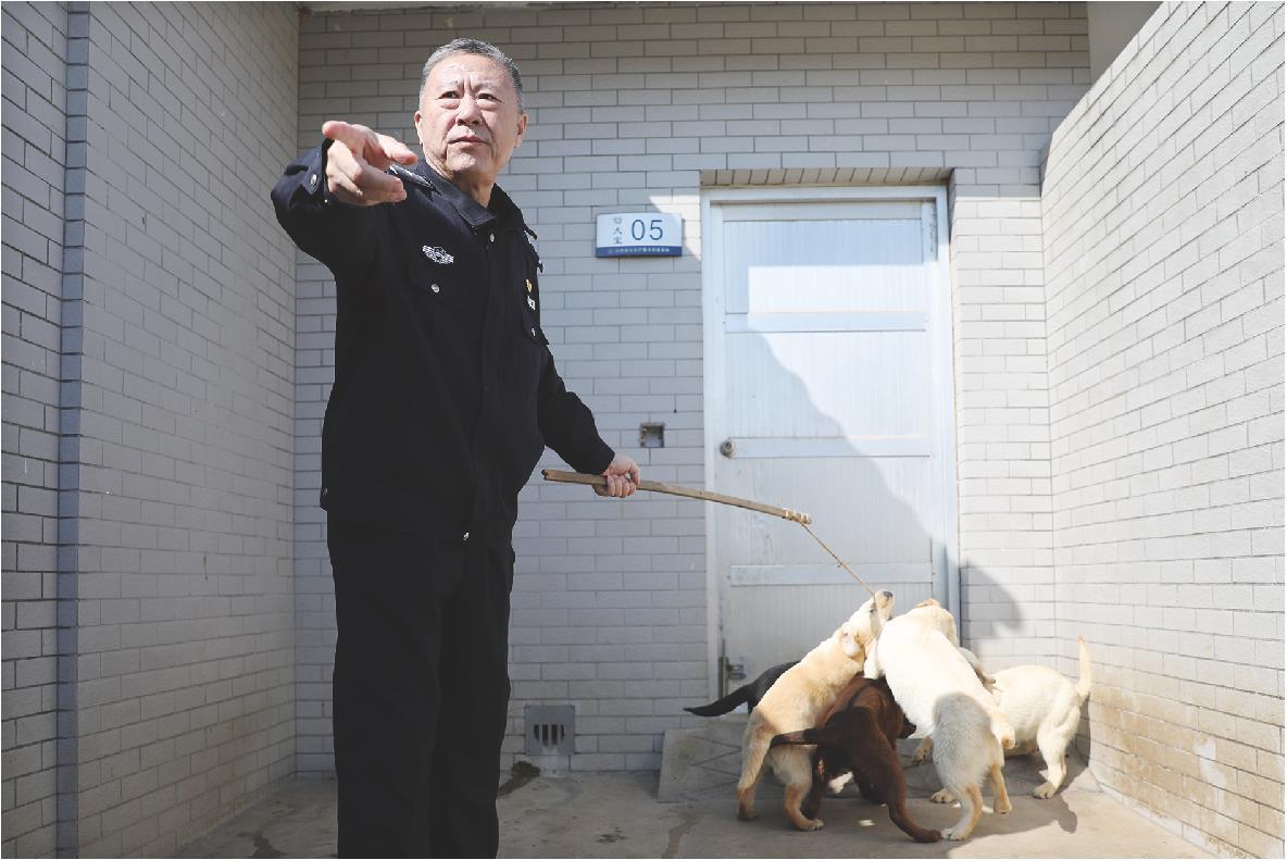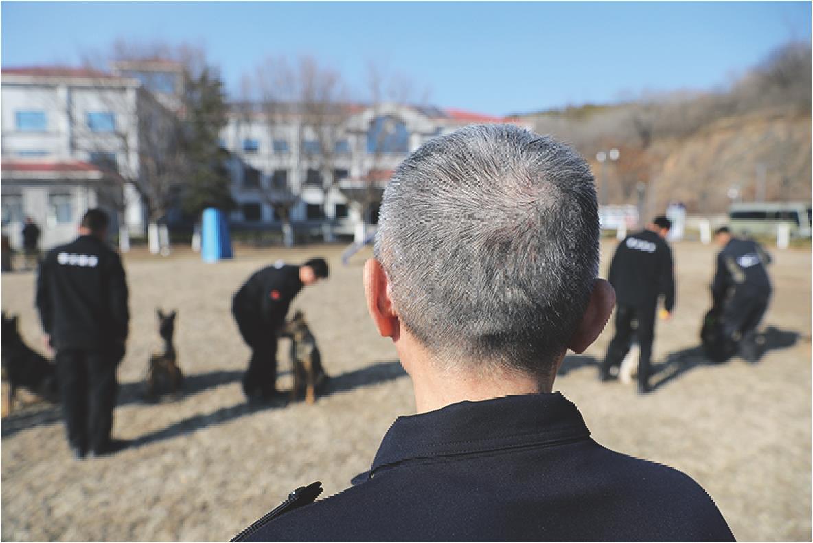 头发花白的黄庆喜带领年轻的警犬驯导员进行集体训练。