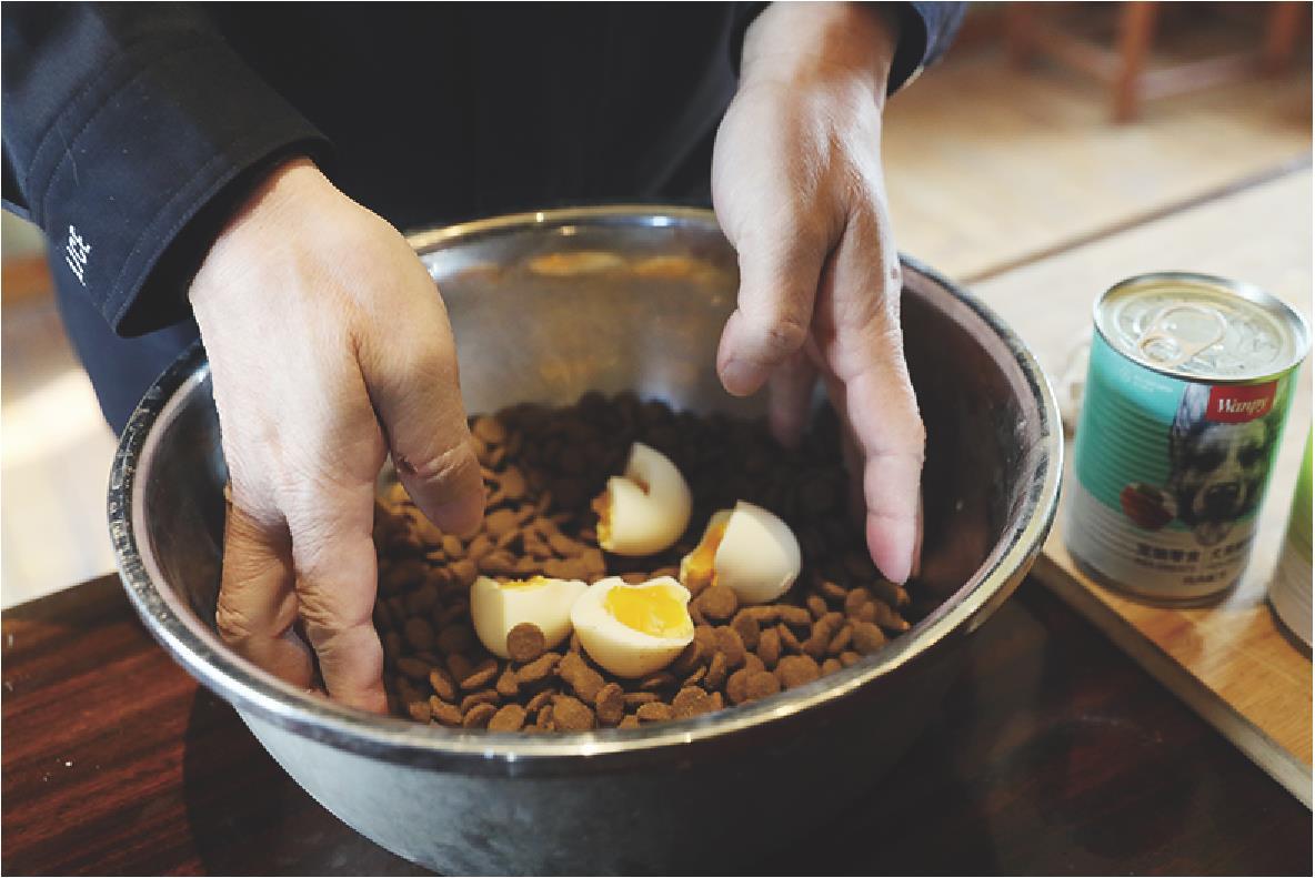 黄庆喜用狗粮奖励进行障碍环境训练的拉布拉多幼犬。