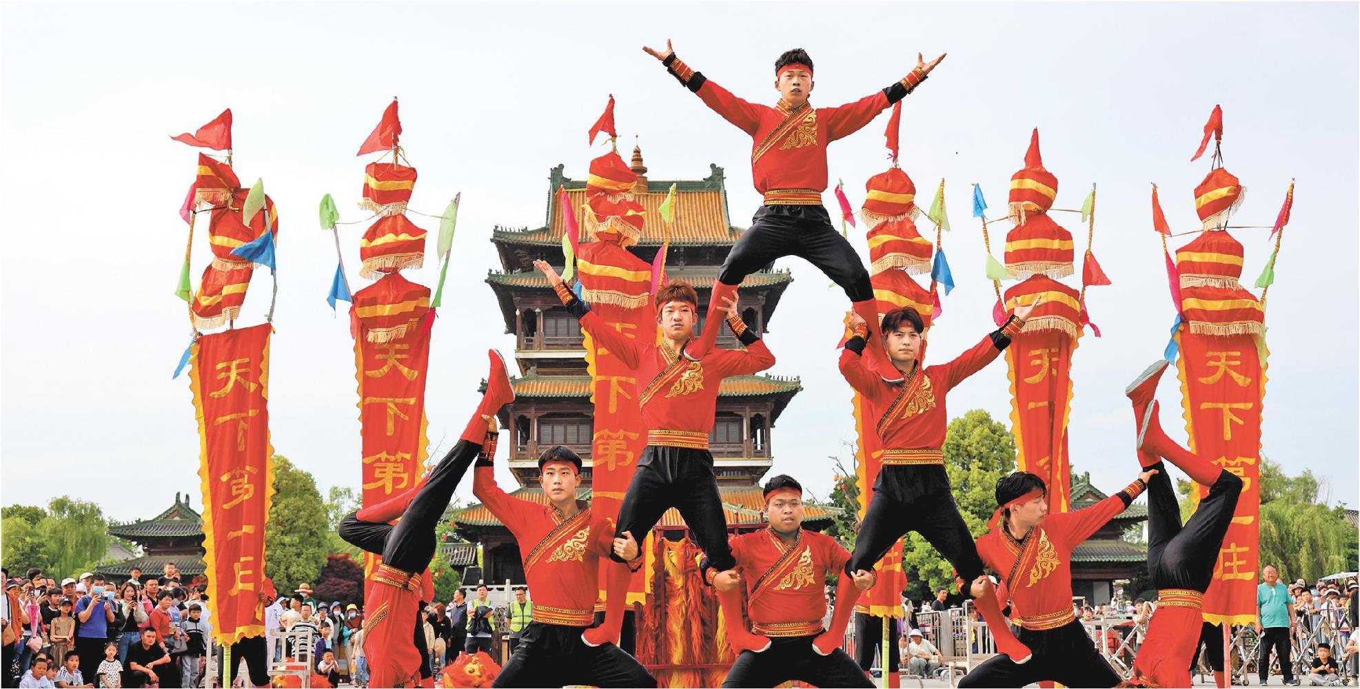 5月3日,民间艺人在枣庄市台儿庄古城向游客表演非遗项目。“五一”假期,在台儿庄古城,丰富多彩的民俗展演活动轮番上演,让游客近距离感受传统民俗文化的魅力。