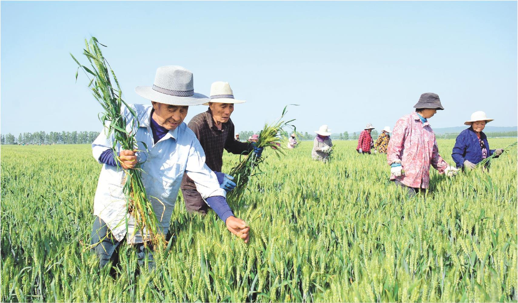 5月13日,临沂市郯城县归义农场,工作人员一字排开在小麦良种示范基地里,去杂去劣。