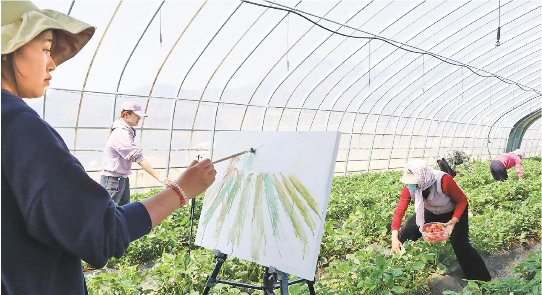 最近,村北的温控大棚内,羊肚菌和草莓进入了采收季。今年,厉家顶子村联手日照康合园电商服务有限公司利用闲置土地发展羊肚菌,每年可为村民带来收入16万元。每当地里种收最忙活的时候,也是王倩妮创作最有灵感的时候。在她眼里,羊肚菌并不艳丽,草莓果个头也不大,却能让村民鼓起钱袋子,大棚虽然土里土气,但承载着村民们发家致富的希望,是最美的风景。丰收的果实、村民的笑脸为她的画作添了一份份灵动。