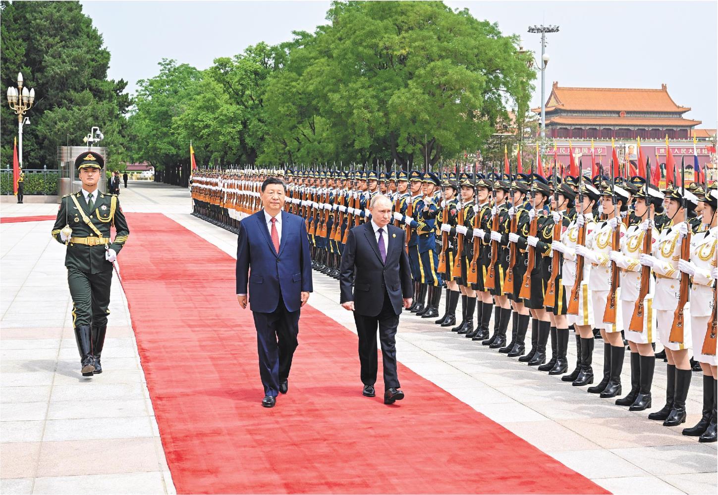 5月16日上午,国家主席习近平在北京人民大会堂同来华进行国事访问的俄罗斯总统普京举行会谈。这是会谈前,习近平在人民大会堂东门外广场为普京举行隆重欢迎仪式。 □新华社记者 饶爱民 报道