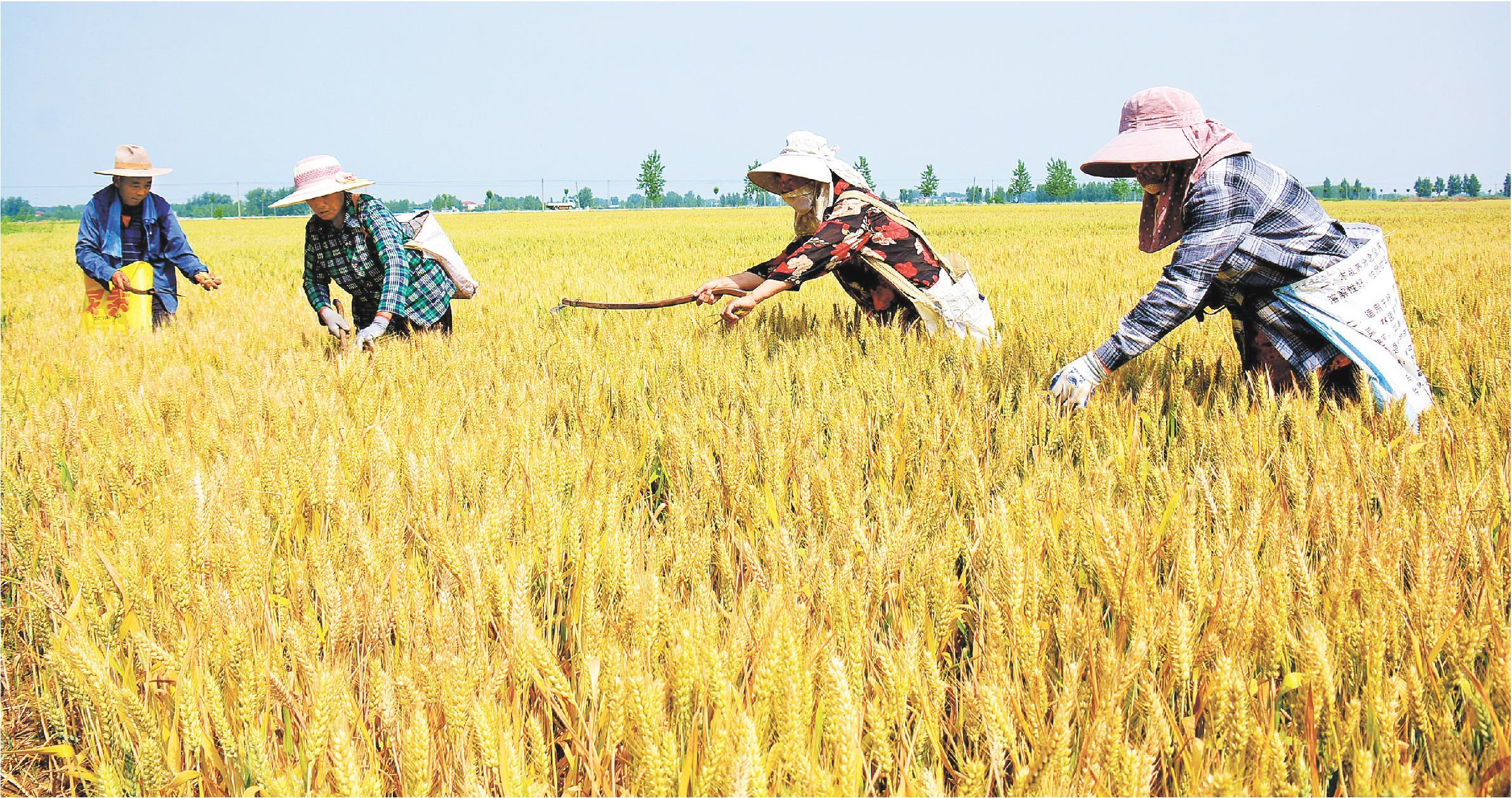时下,小麦进入成熟期,素有“全国粮食生产先进县”美称的郯城县,组织人员身挎背包,手拿镰刀,对小麦良种进行去杂去劣,确保良种纯度,为提高粮食产量、品质和粮食安全提供坚强保障。图为5月27日,在郯城县郯城街道万亩高产示范田里,农民在精选良种。