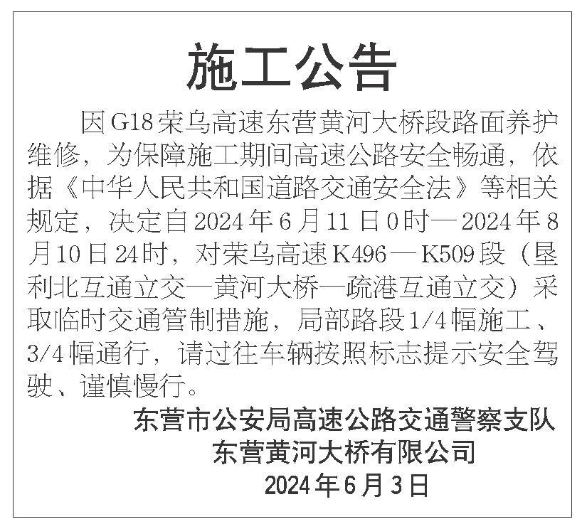 因G18 荣乌高速东营黄河大桥段路面养护维修,为保障施工期间高速公路安全畅通,依据《中华人民共和国道路交通安全法》等相关规定,决定自2024年6月11日0时—2024年8月10日24时,对荣乌高速K496 —K509 段(垦利北互通立交—黄河大桥—疏港互通立交)采取临时交通管制措施,局部路段1/4幅施工、3/4幅通行,请过往车辆按照标志提示安全驾驶、谨慎慢行。