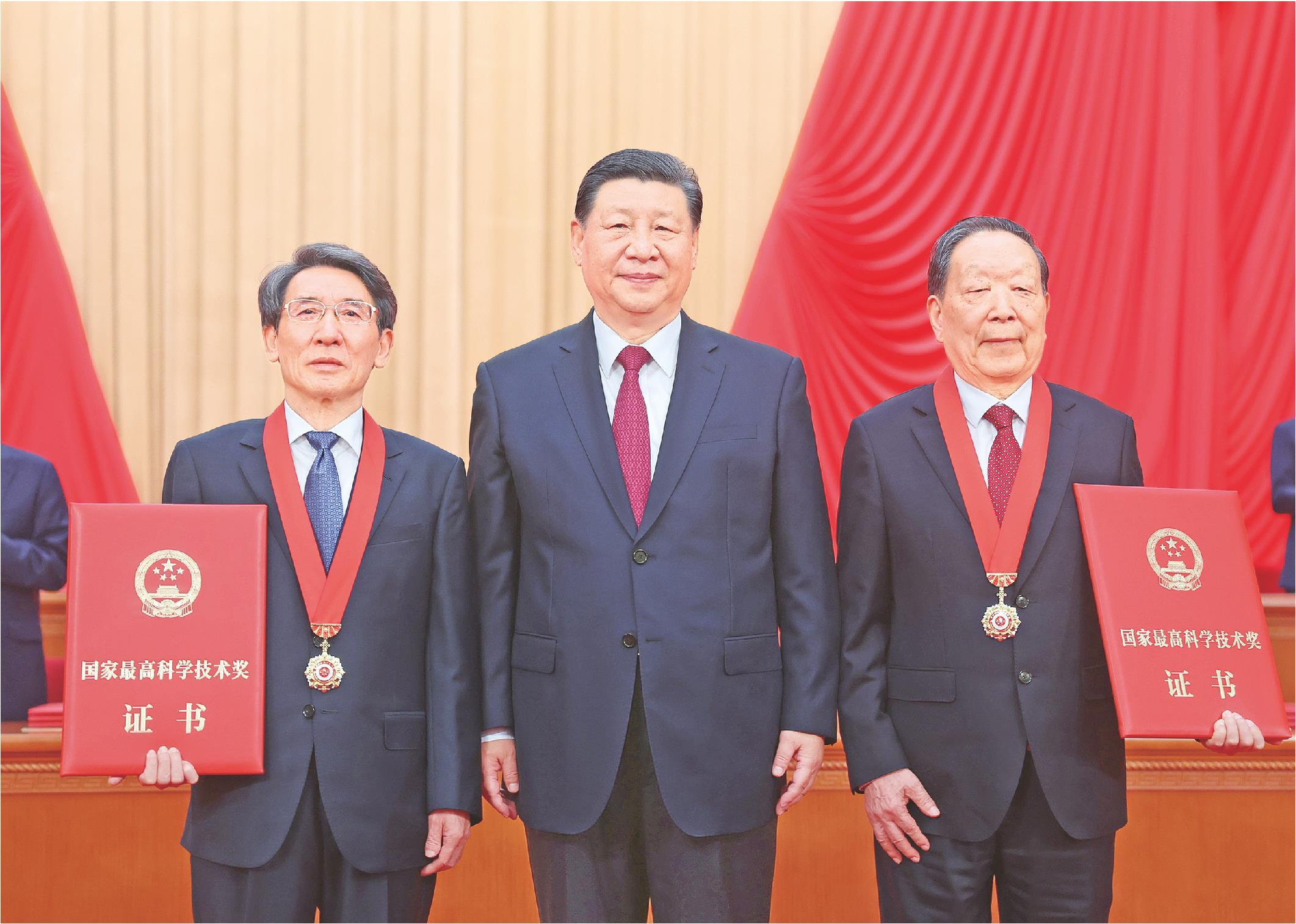 6月24日,全国科技大会、国家科学技术奖励大会和中国科学院第二十一次院士大会、中国工程院第十七次院士大会在北京人民大会堂隆重召开。中共中央总书记、国家主席、中央军委主席习近平向获得2023年度国家最高科学技术奖的武汉大学李德仁院士(右)和清华大学薛其坤院士(左)颁奖。 □新华社记者 鞠鹏 报道