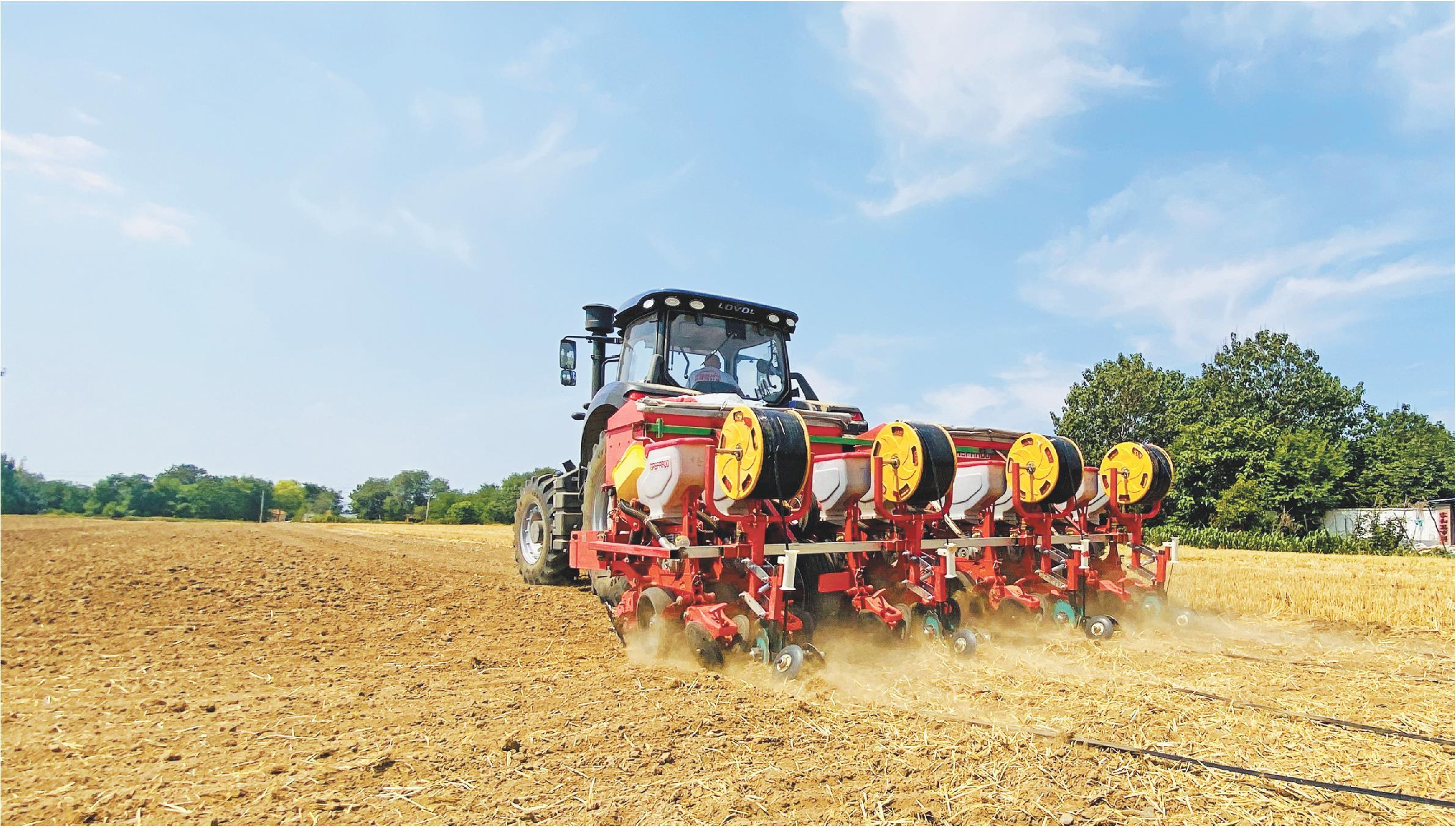6月19日,在淄博市临淄区一处农田里,农民在操作农机进行带状复合种植,播种大豆和玉米。