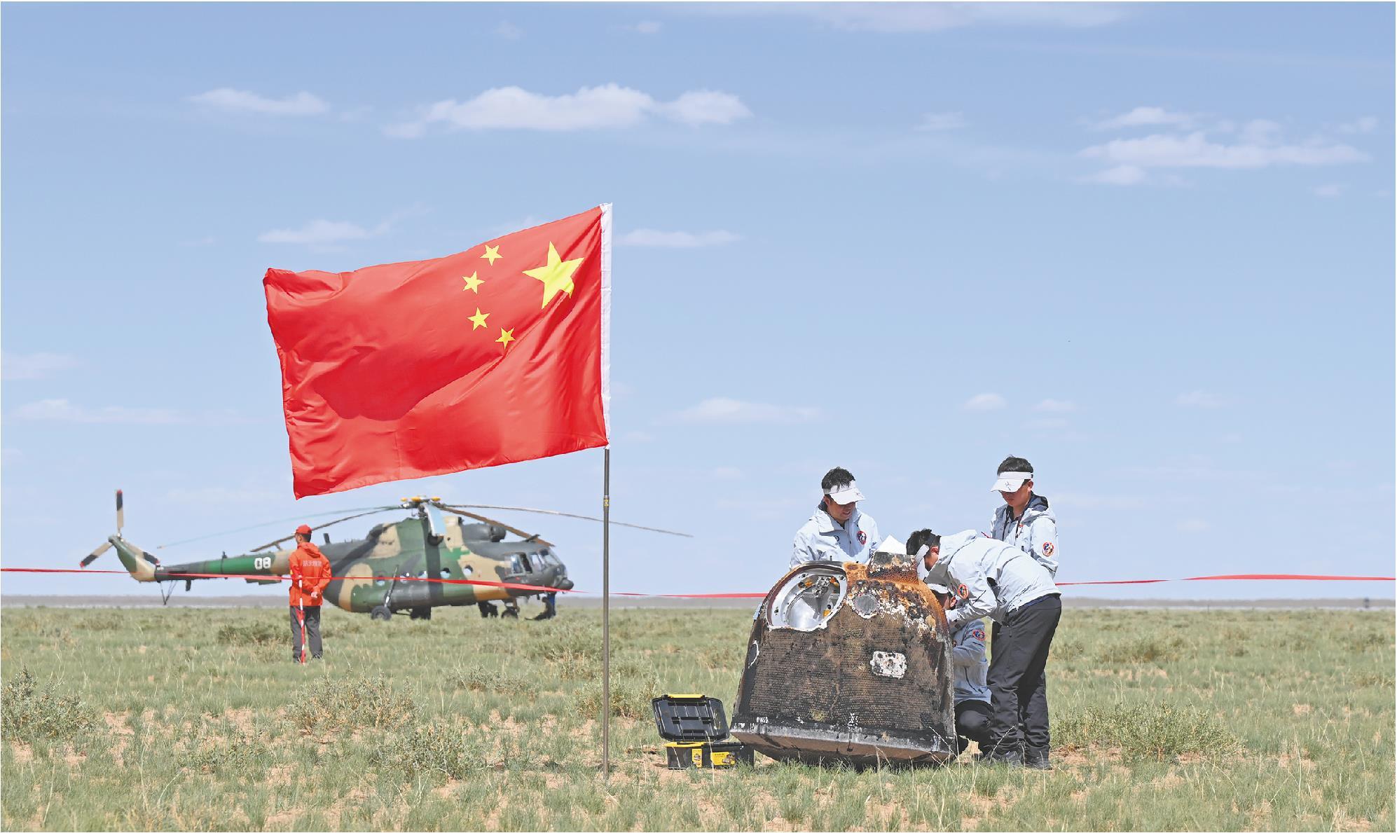 6月25日14时7分,嫦娥六号返回器携带来自月背的月球样品安全着陆在内蒙古四子王旗预定区域,探月工程嫦娥六号任务取得圆满成功。 □新华社记者 贝赫 报道