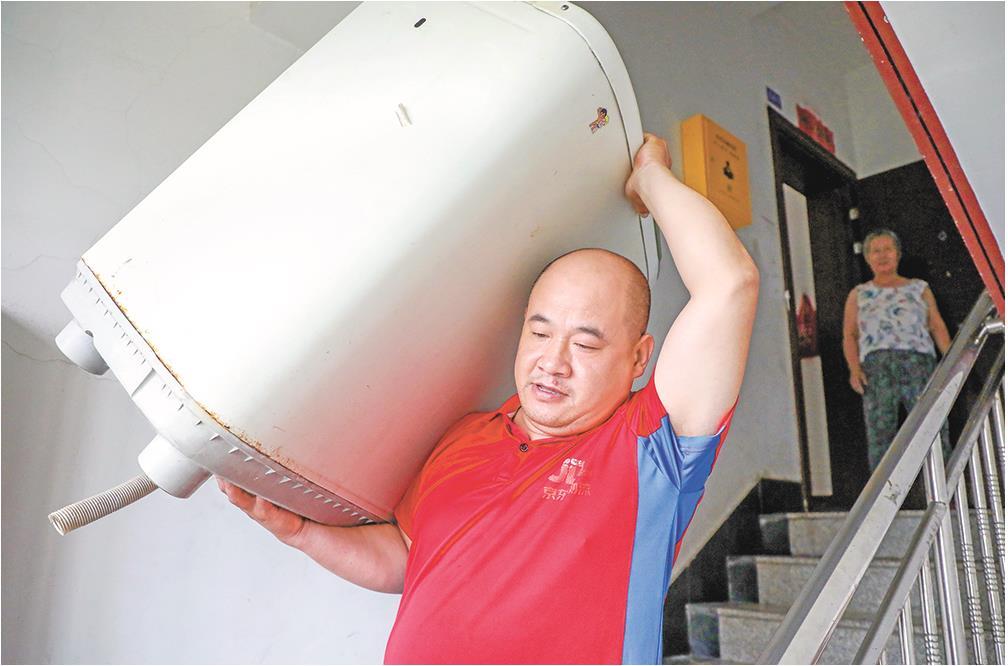 聊城市茌平区宏大智家体验店回收员谭建军将消费者家中的废旧洗衣机搬下楼。