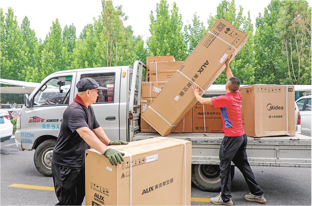 在聊城市茌平区阳光·福林里小区,工人将以旧换新的新家电送到消费者家中。
