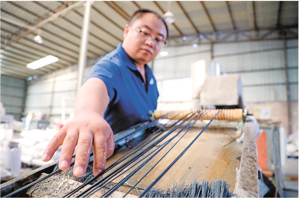 在聊城市茌平区的一家塑料改性造粒车间,工作人员查看再生塑料生产情况。