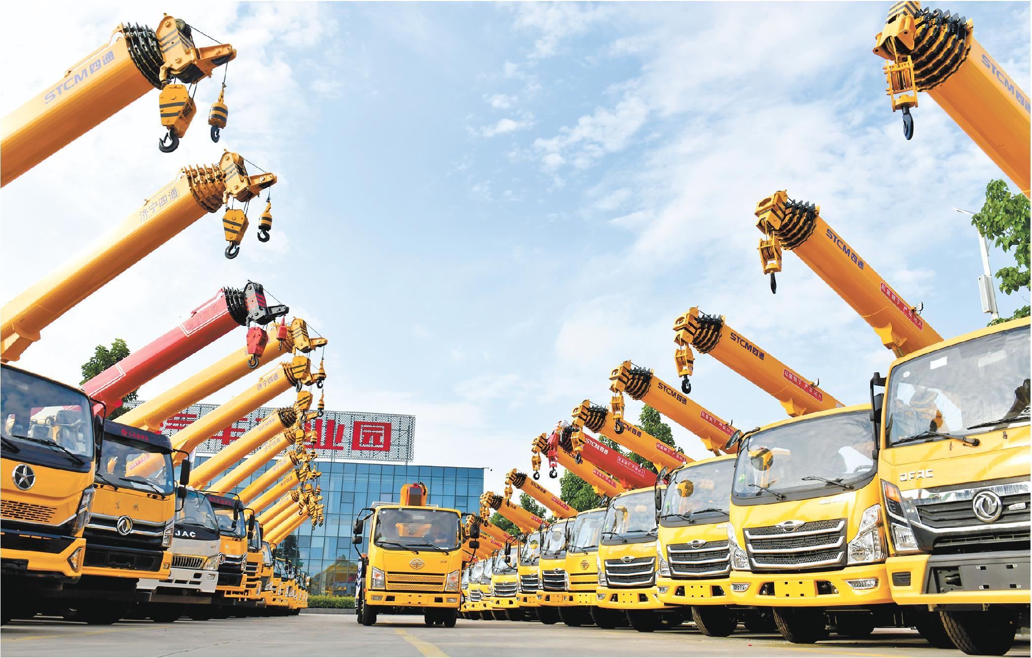 8月4日,在济宁四通工程机械有限公司总装车间,一辆吊车开往堆场。