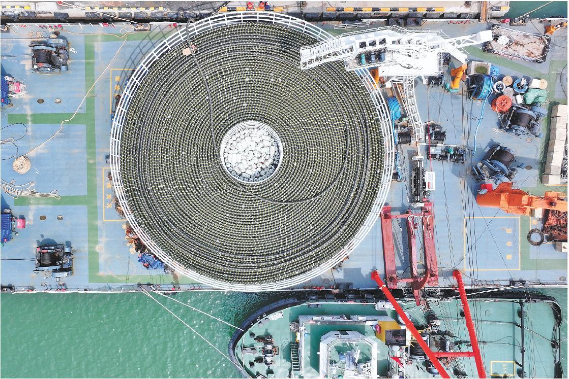 8月6日,东营港胜利码头,工人正在对海底电缆进行装船检测。该海缆长达35公里,是全省单根最长无接头220千伏海缆。