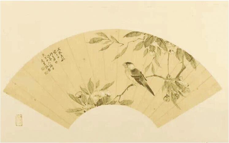 清张槃花鸟图扇,纵17.8厘米,横51.7厘米,现藏于济南市博物馆。左上方题:戊辰立秋前三日,仿王若水法,奉夫子大人诲正,受业张槃。