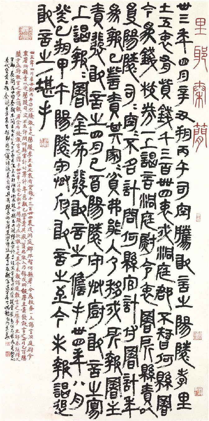 “一画之间,变起伏于锋杪;一点之内,殊衄挫于毫芒。况云积其点画,乃成其字”。书法是线条的艺术,体现在线条的质感、力量、节奏变化之美。怀馥在书法研习创作时,上承古风,立足传统,追求正大气象的书法风格,注重线条的表现形式,强调书写性和文化性,近阶段发轫于秦简牍书、汉篆碑刻等书学方向,着力于对厚重朴茂的追寻,细致而敏感地发掘、发挥其线条的转化之功,并能够与绘画创作相融合。