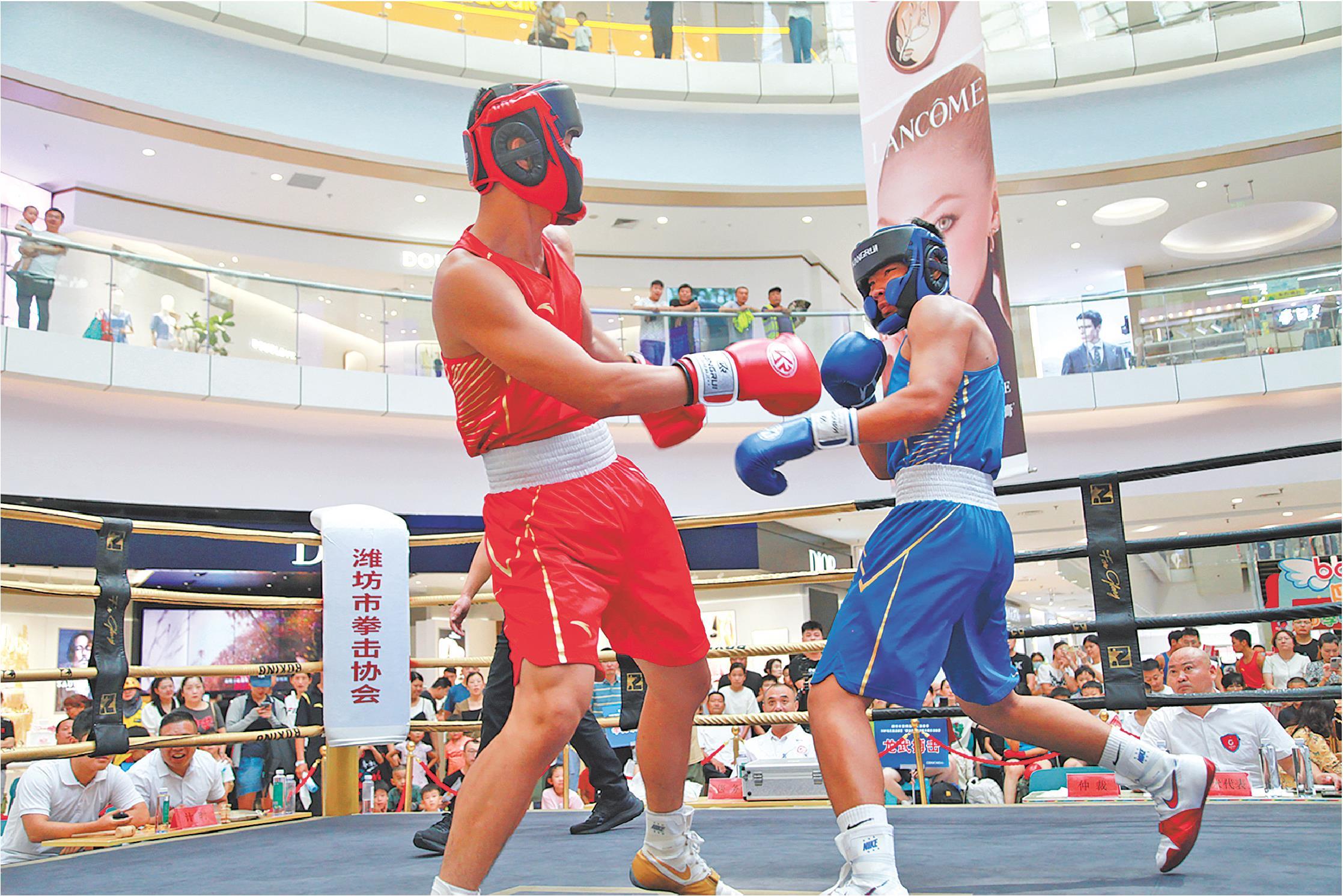 8月17日,潍坊市第四届体育旅游季WBF地区选拔赛暨“康瑞杯”潍坊拳击俱乐部联赛在潍坊银座购物中心开赛,来自全省的21家俱乐部300余名拳击运动员齐聚潍坊,“拳”力出击。