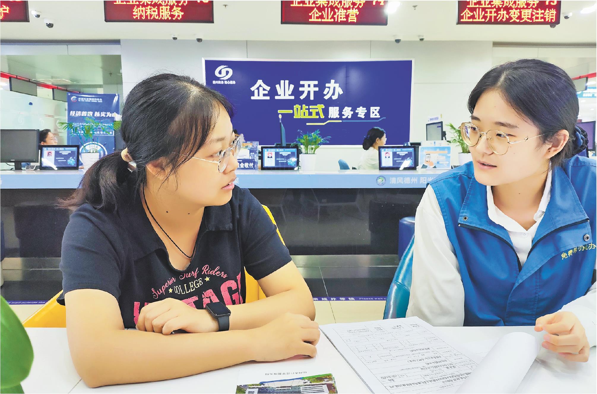 在德州市政务服务大厅,工作人员为申请人提供“企业设立一件事”帮办代办服务。