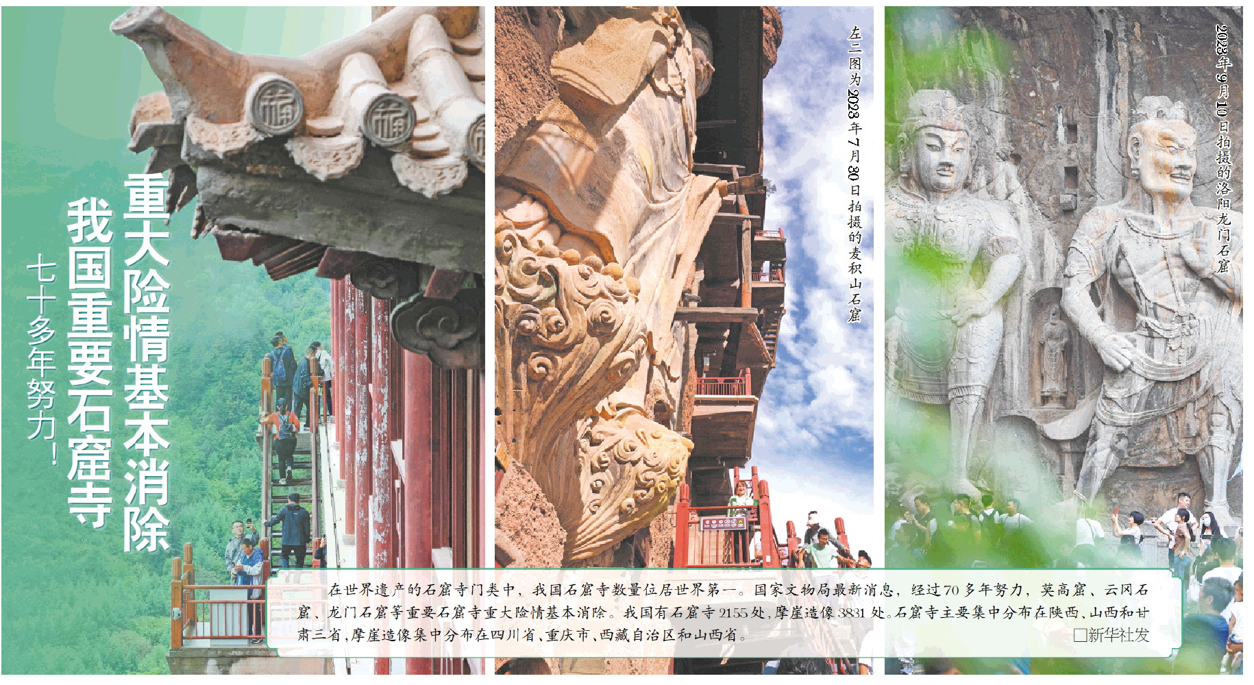 在世界遗产的石窟寺门类中,我国石窟寺数量位居世界第一。国家文物局最新消息,经过70多年努力,莫高窟、云冈石窟、龙门石窟等重要石窟寺重大险情基本消除。我国有石窟寺2155处,摩崖造像3831处。石窟寺主要集中分布在陕西、山西和甘肃三省,摩崖造像集中分布在四川省、重庆市、西藏自治区和山西省。 □新华社发