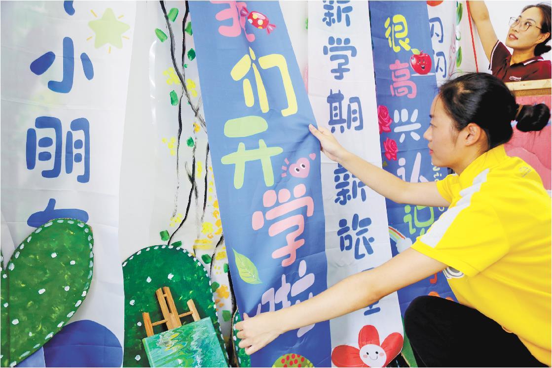 8月26日,在江苏省连云港市钟声幸福幼儿园,老师在布置开学条幅。开学在即,各地做好准备工作,迎接新学期。