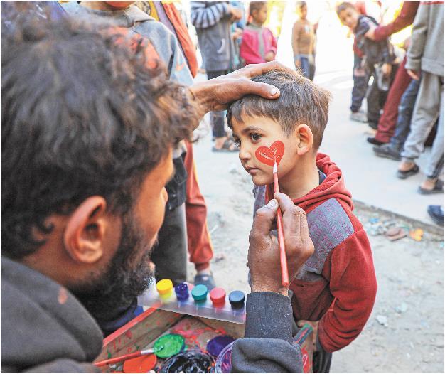 在加沙地带中部城市代尔拜拉赫的一所学校内,巴勒斯坦儿童参加当地志愿者组织的关爱儿童活动。(□新华社发)