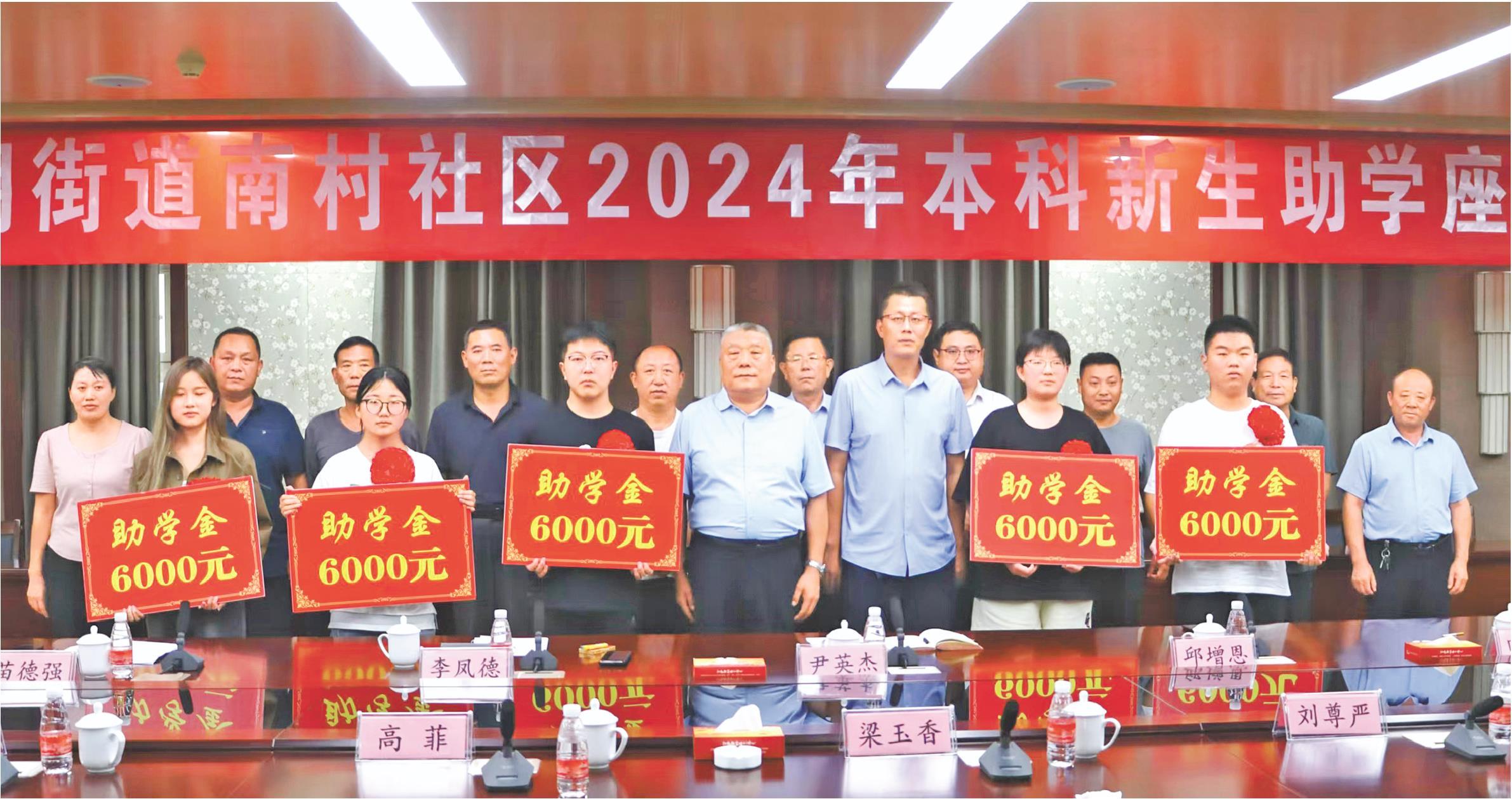 8月25日,沂南县界湖街道南村社区召开2024年度大学本科新生助学座谈会,为村里6名大学新生每人发放6000元助学金,其中五名学生现场领取,一名学生因开学线上领取。