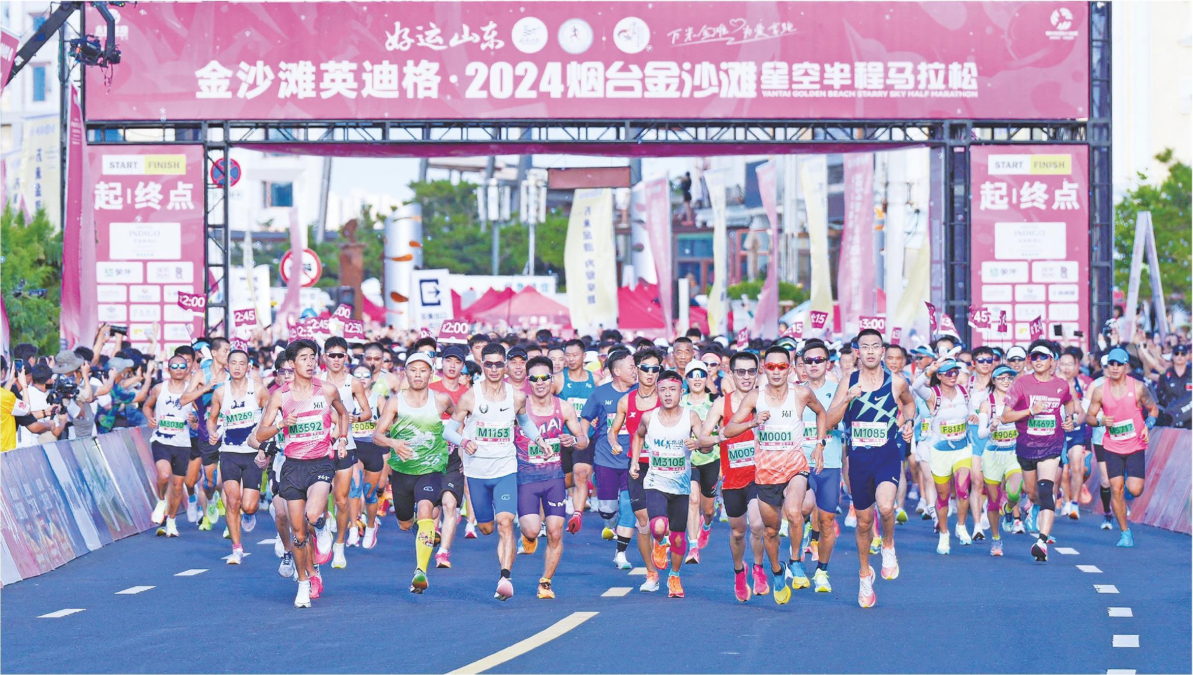 本报烟台讯 8月31日17时许,2024烟台金沙滩星空半程马拉松在烟台黄渤海新区沙丘之风广场开跑(上图)。近万名选手体验沿着海岸、披着晚霞、追逐星光的马拉松新跑法。