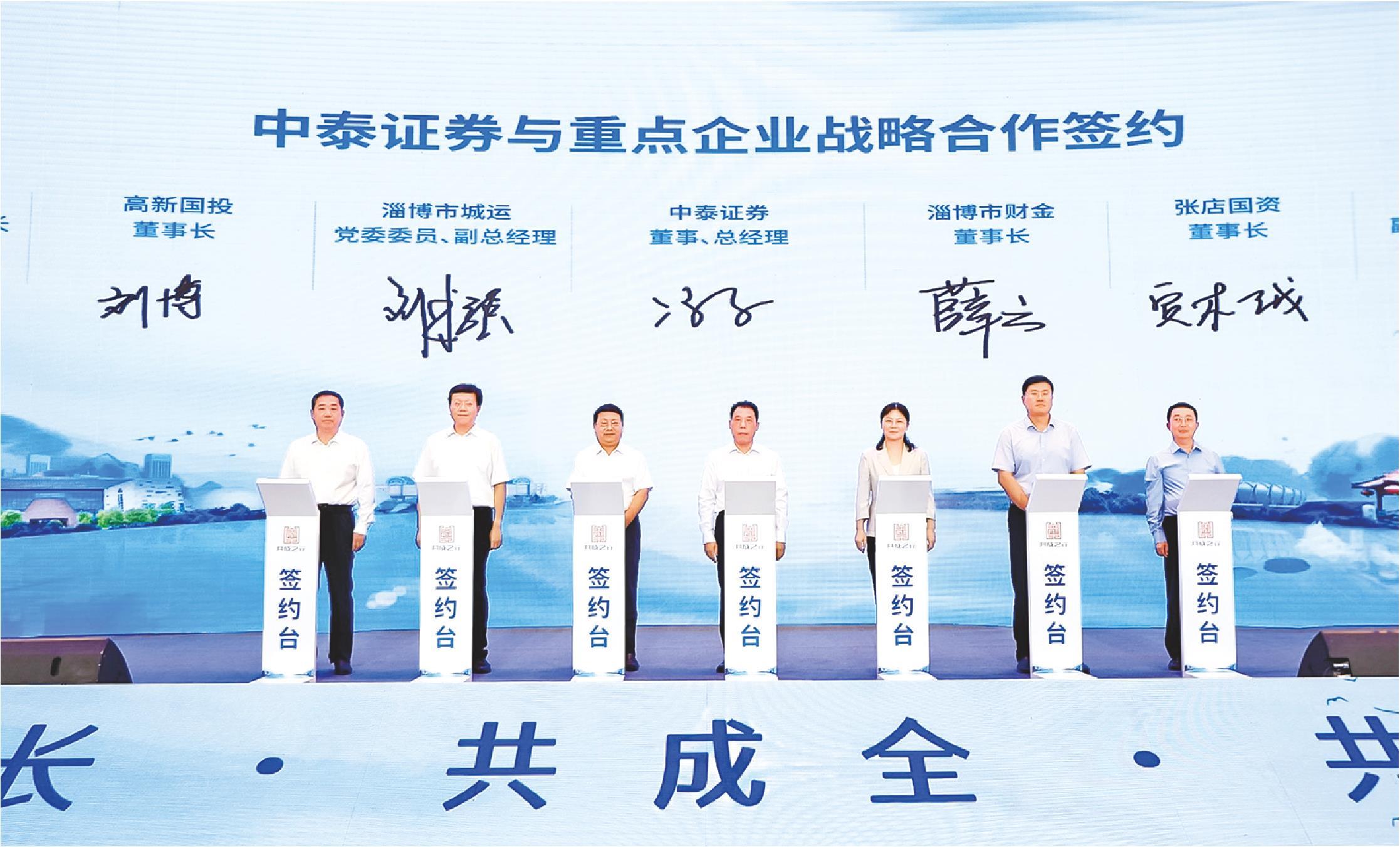 王洪说,共成长,旨在为淄博市中小微企业提供多元化、接力式全生命周期金融服务,以资本赋能助力中小微企业茁壮成长、由小变大。共成全,旨在为淄博市成长期企业提供上市融资、债券融资、跨境融资、财富管理、风险管理等全方位、一体化资本市场服务,以产融结合助力成长期企业创新发展、由大变强。共成就,旨在为淄博市成熟期企业提供产业整合、并购重组、研究智库等一对一、精准化服务,与企业成为价值共同体、命运共同体,以双向驱动助力企业跨越发展、由强变优。中泰证券将在加快建设现代化产业体系、发展新质生产力、加速绿色转型、推动共同富裕等方面,与淄博市同题共答、同向发力,打造地企同心、共成共赢的合作典范。