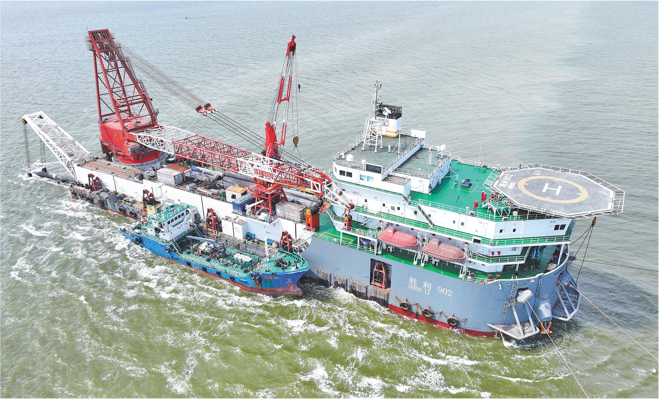9月9日,在东营港25万吨单点系泊码头项目建设现场,胜利902铺管船正在进行海底管道铺设。