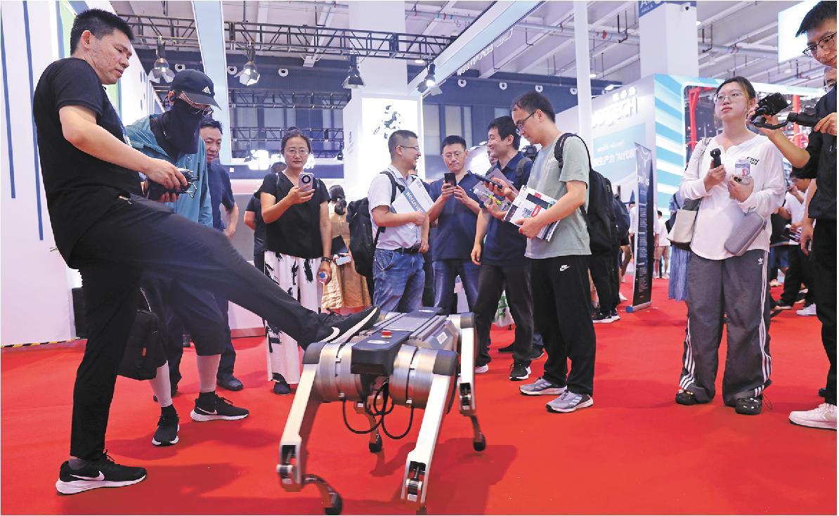 在2024世界机器人大会上,山东优宝特智能机器人有限公司副总经理陈彬向观众介绍四足智能机器狗。