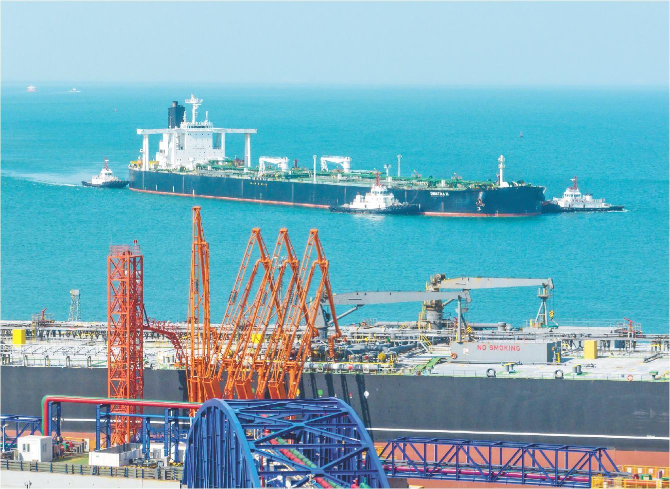 山东港口烟台港,一艘装载26.4万吨进口原油的超大型油轮抵靠。