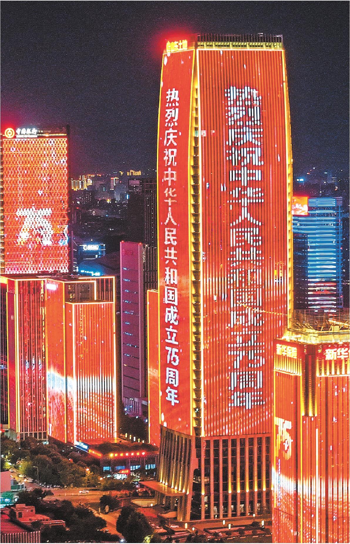 图:10月1日,济南市经十东路奥体片区灯光表演。(□新华社发)