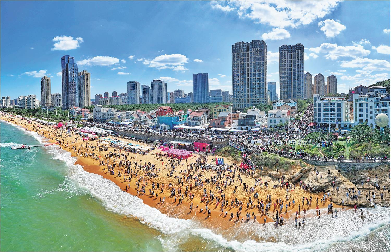 图:10月2日,市民游客在威海国际海水浴场游玩。(□新华社发)