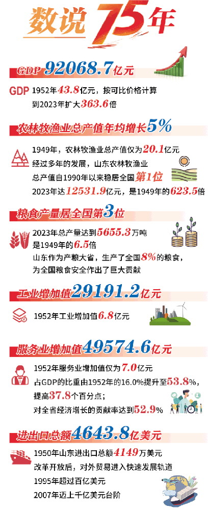 七十五载栉风沐雨,在中国共产党的坚强领导下,亿万山东人民不忘初心、勇毅前行,用汗水浇筑实力、用劳动成就梦想,从苦弱贫乏到齐鲁样板,从白手起家到百业兴旺,从解决温饱到全面小康,齐鲁大地发生了翻天覆地的变化。特别是党的十八大以来,山东坚持以习近平新时代中国特色社会主义思想为指导,深入贯彻落实习近平总书记对山东工作重要指示要求,践行新发展理念,主动服务和融入新发展格局,统筹扩大内需和深化供给侧结构性改革,统筹新型城镇化和乡村全面振兴,统筹高质量发展和高水平安全,纵深推进绿色低碳高质量发展先行区建设,深入实施“三个十大”行动,努力扛牢大省担当,推进中国式现代化山东实践迈出坚实步伐。