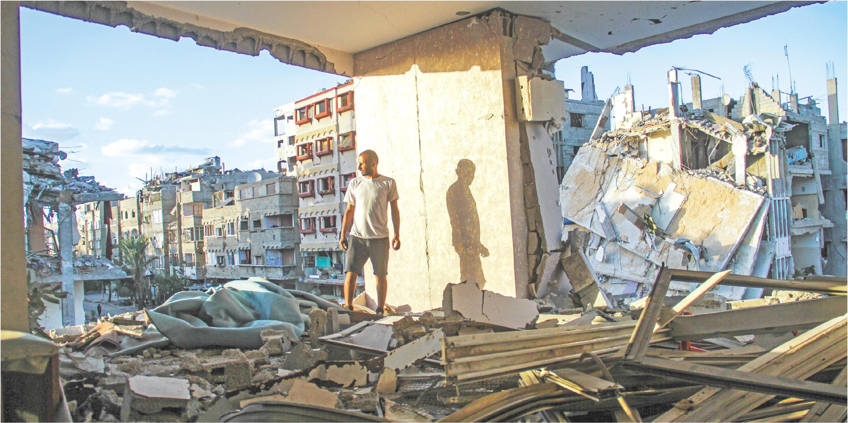10月6日,在加沙地带北部杰巴利耶,一名男子站在建筑废墟上。
