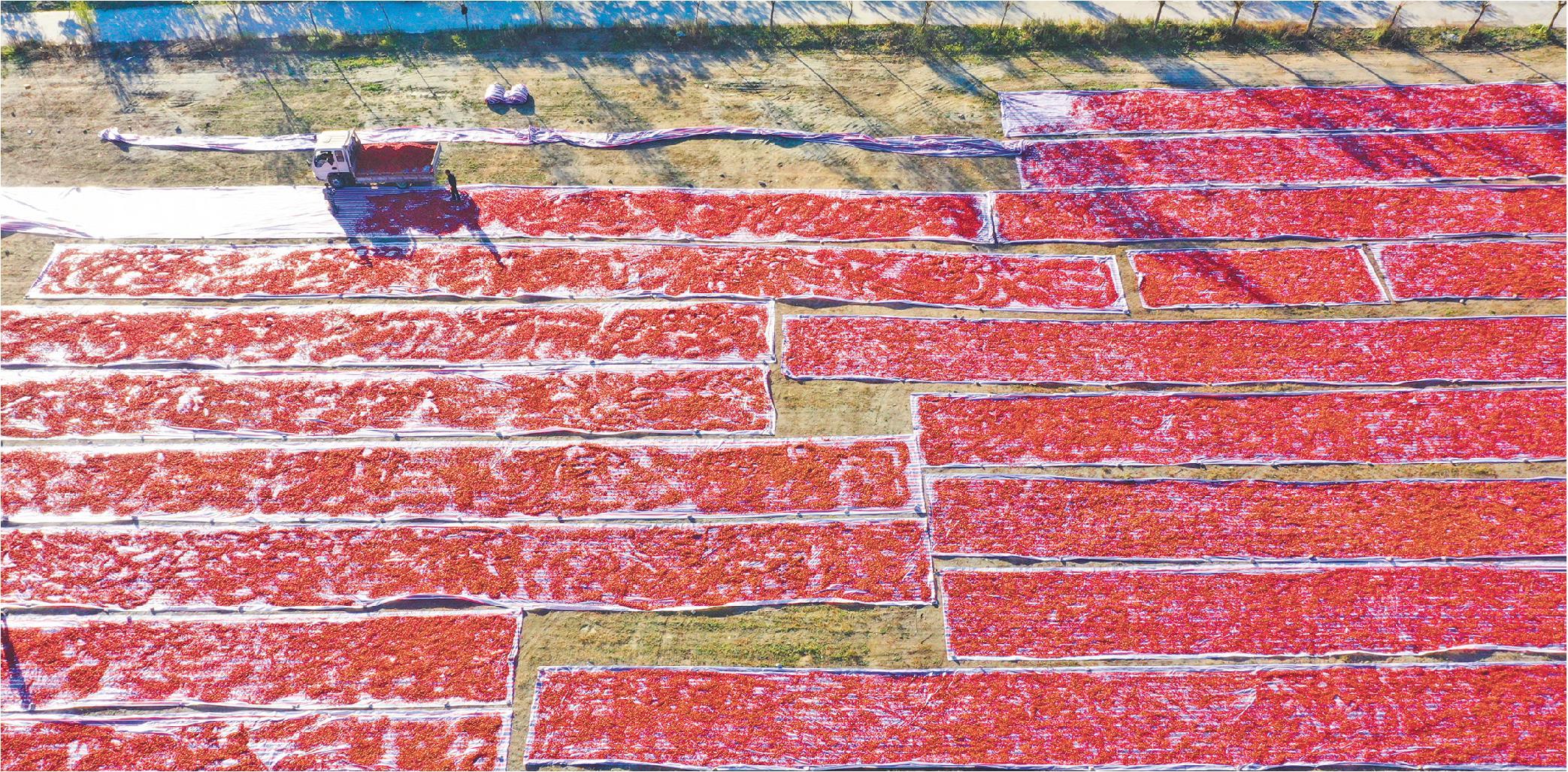 10月19日,农民在河北省遵化市一家山楂专业合作社晒场晾晒收获的山楂(无人机照片)。