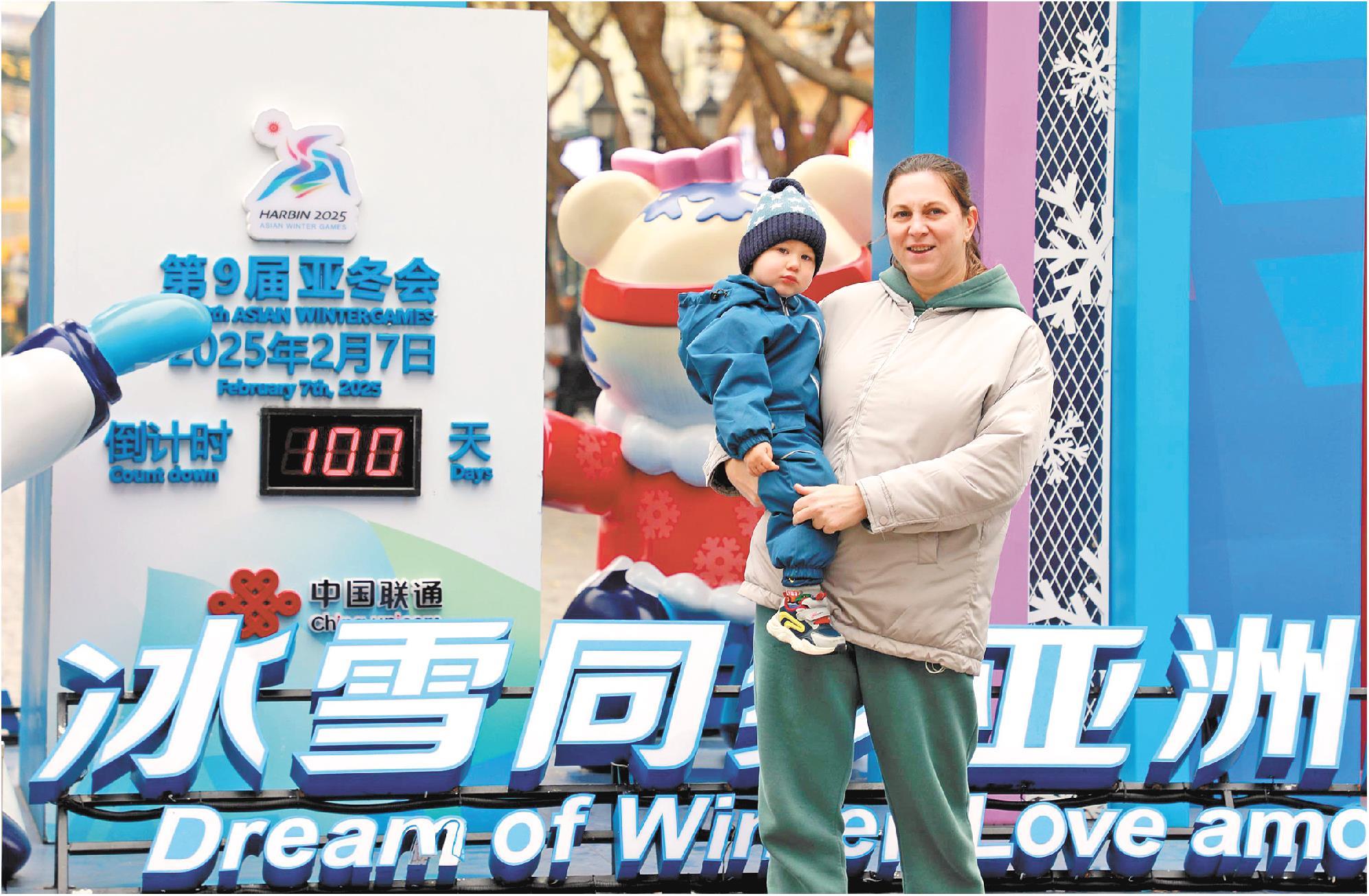 10月30日,在哈尔滨中央大街,游客在亚冬会倒计时牌前留影。(□新华社发)