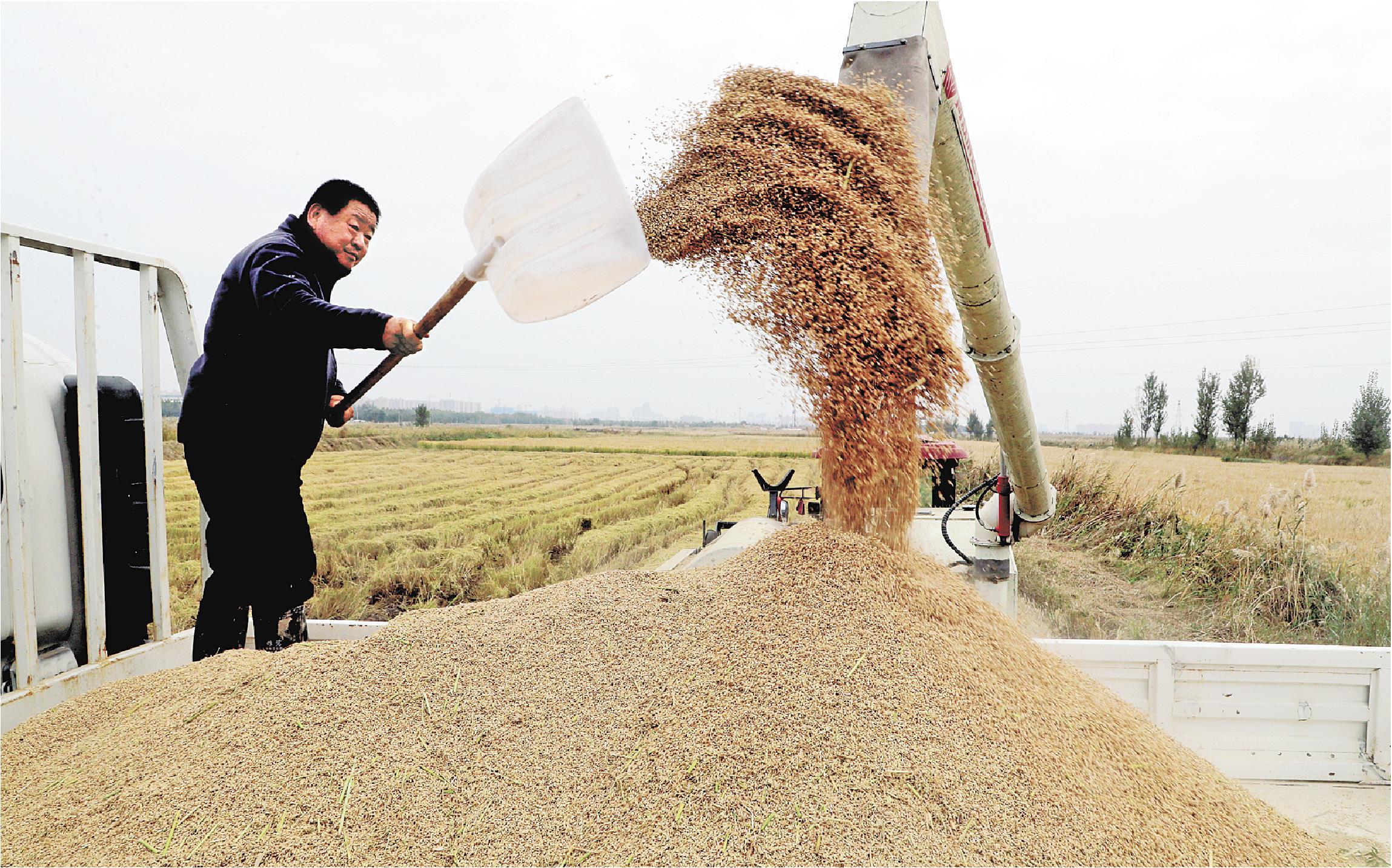 10月21日,在东营市东营区文汇街道跨村联建共富产业基地,农民正在晾晒新收割的富硒水稻。