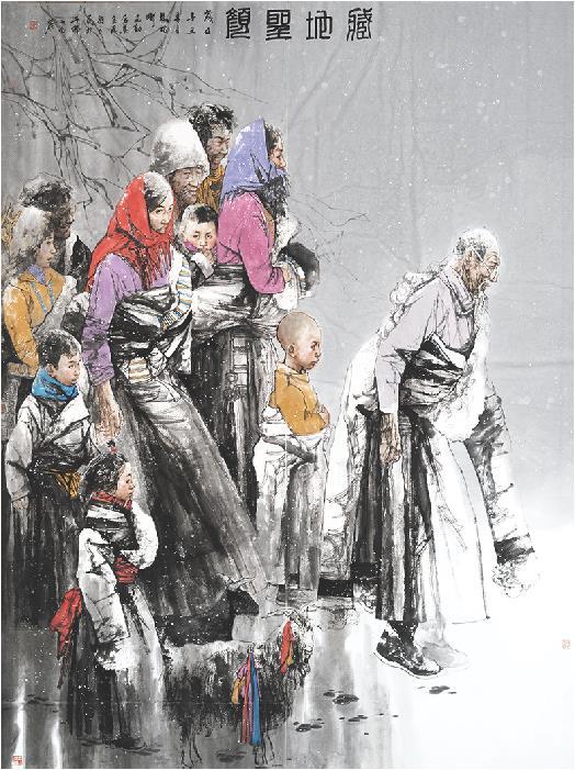 以当代的典型环境、事件和人物,或者以俯视、仰视等视角,用新的构图和表现形式进行呈现,也常常令人耳目一新。国画作品中,杨晓刚《藏地圣颜》以风雪为视角,展现出藏民不惧风雪,幸福而又充满希望地跟随长者砥砺前行的人文精神内涵。“飞雪迎春到”之意境立现。极简的背景与错落有致的细致人物刻画、风雪环境与藏民脸上的笑容和坚毅神情以及遒劲的人物线条形成强烈反差,更加凸显主体人物勇者无畏的奋进精神和形象。周森、卢冰、张丽娜、於德伟《阿姐是我好榜样》以小妹手中阿姐的清华大学录取通知书为视角,以羊群的平远构图为广阔背景,展现出党和国家政策为牧民的教育和生活等诸多方面带来的巨大改变和希望。李恩成《滴翠》以儿时记忆中的花草虫鸟世界为视角,借助没骨手法,以大片翠色和细致刻画,及其所表达的童年追忆的朦胧感和清晰感的强烈对比,强化了情感的表达,令人立于画前,“静闻空翠滴”。孙棋《调味·人生》以调味的多重含义为视角,通过用墨设色的情理之中、意料之外探索笔墨色和人生的况味。冯超《共生》以手机、平板作为这个时代的典型符号,表现共时空、共生的网络时代及其对生活方式的影响。