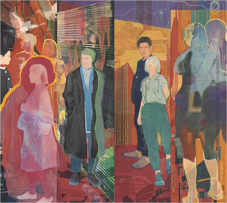 国画作品中,李兆虬《布谷催春》将颇具节奏韵律之美的多个早春劳动场面同构于同一审美时空中。巧妙的留白既分割又连接了审美时空。在视觉和心理的不断转场中呈现出姚鼐“布谷飞飞劝早耕,舂锄扑扑趁春晴”的热火朝天的劳动画面感与诗境。于新生《阳春三月》以山和云等作为审美时空分隔要素进行转场,不同动态的劳动场景以意象造型的方式呈现,颇具新意。赵鹏、宋欣《熠熠华彩》以视觉由表及里、时空由传统到当代的方式,进行了三个视觉层次的审美时空同构,同时又对画面进行了分割,以若隐若现的方式留给观者无尽的想象空间,体现出华彩承脉的主题。张萱子《青春编码》以类似屏风的数智影像方式分割了审美时空,凸显出人工智能时代青春影像和意象的典型特征。综合材料绘画中,涂少辉《羲和逐日》以关于时空维度、平行空间、时空弯曲等宇宙科学视角,把中国传统神话故事“羲和逐日”与中国首颗太阳探测科学技术试验卫星相结合进行立意构思,运用空间叠层和平面延展弯曲的结构,以及绚丽饱和的色彩之美、温暖明亮的光感表达对这个美好时代的时空认知和审美情感。崔立豹《时代印记·Ⅴ》的三联式构图借助拼贴、拓印、反复叠加,并辅以漆艺等艺术手法,试图以蓑衣、马灯等民俗文化符号唤醒观者沉淀的记忆,又通过想象自主链接到当代的雨衣和新光源的马灯,具有了童年与当下的时空转场。