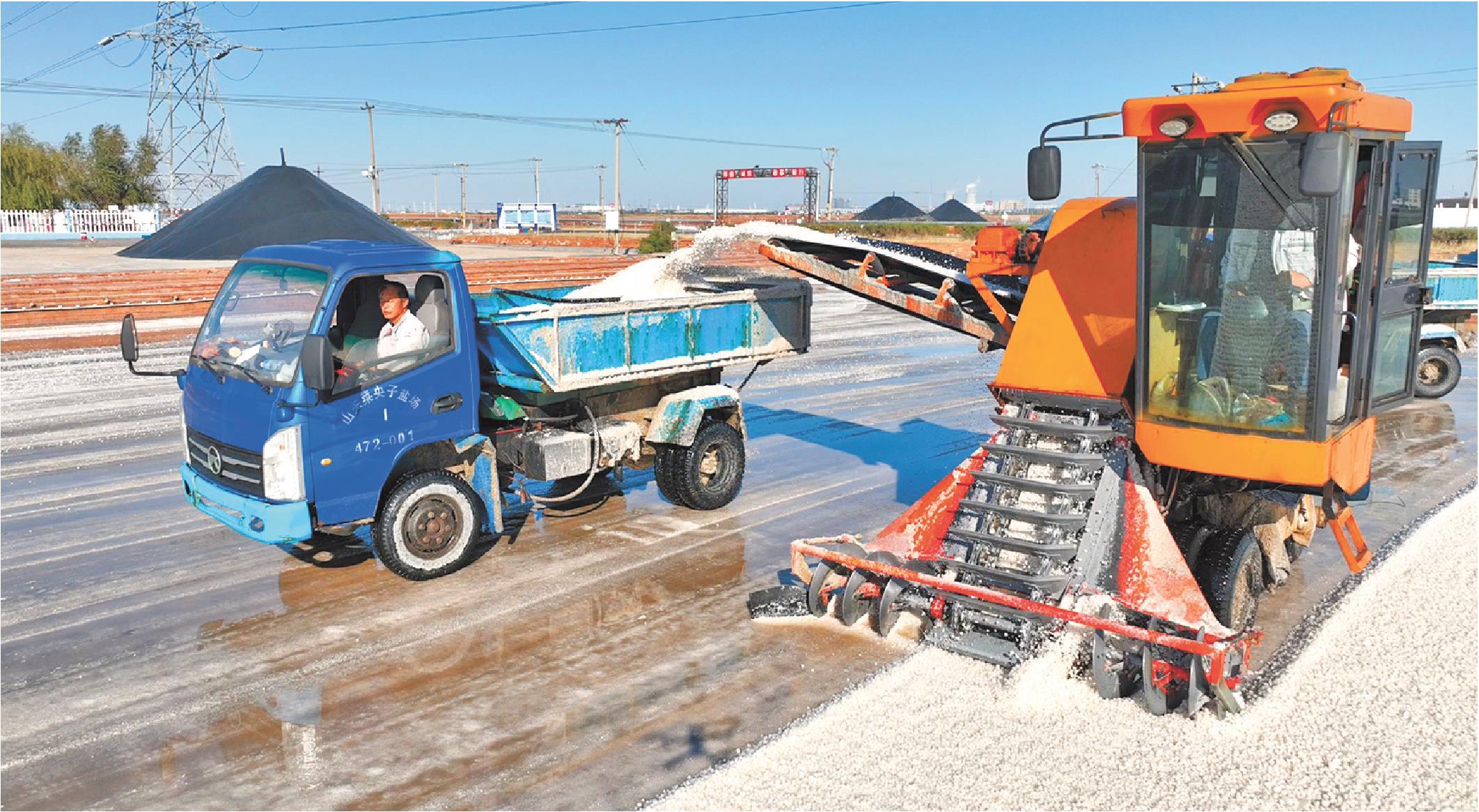 眼下,正值秋盐收获季节。在位于潍坊寿光市羊口镇的山东菜央子盐场,工人们正抢抓晴好天气收获秋盐。只见广阔的盐池里,收盐机与运输车穿梭其间,将白花花的原盐装上车,随后这些原盐被堆坨传输装置源源不断地输送到了坨顶,堆积成一座座高大的“盐山”。