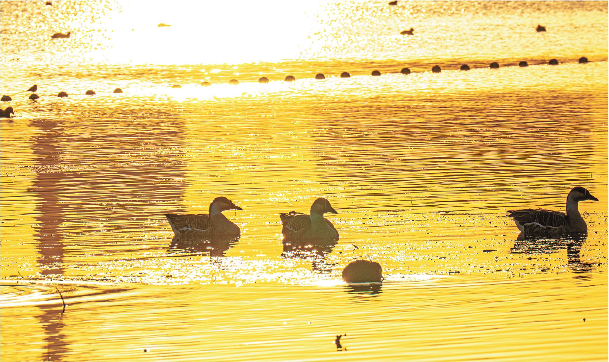 本报济南讯 羽翼轻展映寒晖,群鸟嬉戏逐水归。初冬时节,上百只国家二级保护动物白骨顶鸡如约来到济南华山景区栖息(上图)。自2019年起,每年冬天白骨顶鸡都会来到华山湖越冬,随着华山湖水质改善,现湖区内鸟类有30余种,冬季以白骨顶鸡、罗纹鸭、绿头鸭、白眼潜鸭、赤膀鸭等水鸟为主。