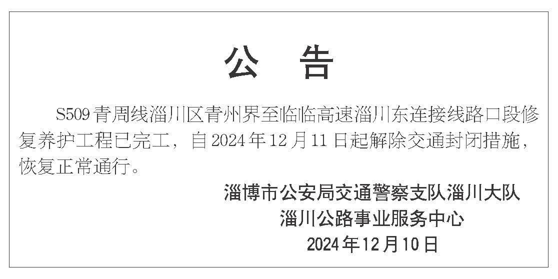 S509 青周线淄川区青州界至临临高速淄川东连接线路口段修复养护工程已完工,自2024年12月11日起解除交通封闭措施,恢复正常通行。