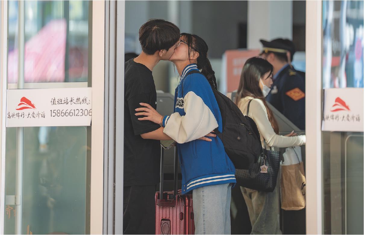 6月份,铁路暑运拉开帷幕,两位年轻人在济南火车站进站口依依不舍,相拥吻别。