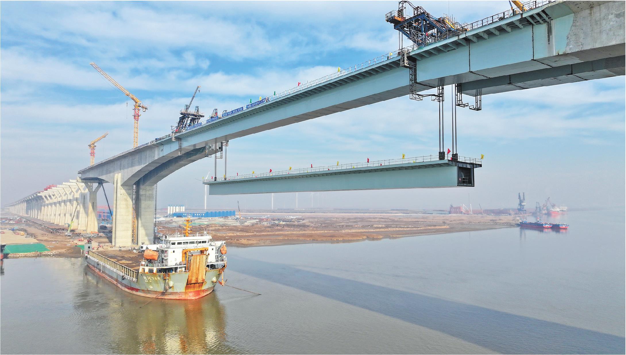 12月29日上午,G228丹东线滨州段套尔河特大桥正式合龙(上图)。该特大桥建成后将成为世界第一跨径混合梁桥,跨径594米。