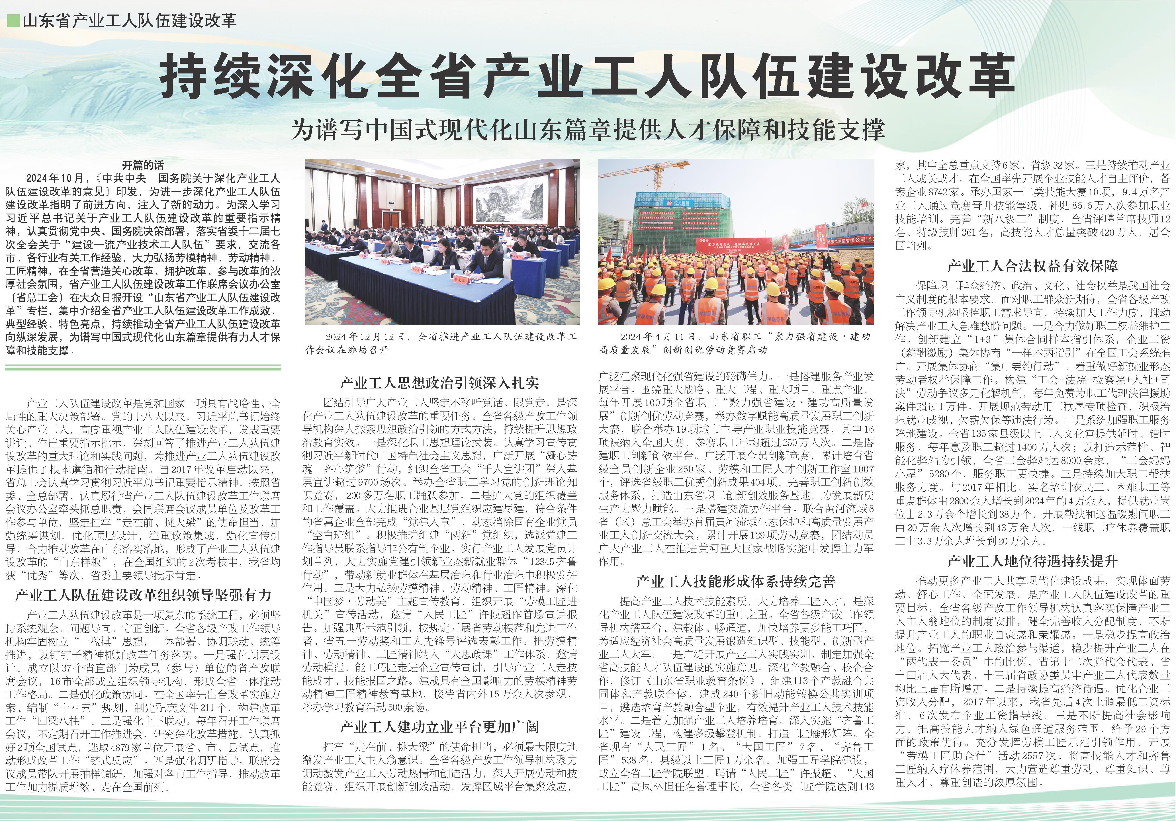 2024年10月,《中共中央国务院关于深化产业工人队伍建设改革的意见》印发,为进一步深化产业工人队伍建设改革指明了前进方向,注入了新的动力。为深入学习习近平总书记关于产业工人队伍建设改革的重要指示精神,认真贯彻党中央、国务院决策部署,落实省委十二届七次全会关于“建设一流产业技术工人队伍”要求,交流各市、各行业有关工作经验,大力弘扬劳模精神、劳动精神、工匠精神,在全省营造关心改革、拥护改革、参与改革的浓厚社会氛围,省产业工人队伍建设改革工作联席会议办公室(省总工会)在大众日报开设“山东省产业工人队伍建设改革”专栏,集中介绍全省产业工人队伍建设改革工作成效、典型经验、特色亮点,持续推动全省产业工人队伍建设改革向纵深发展,为谱写中国式现代化山东篇章提供有力人才保障和技能支撑。